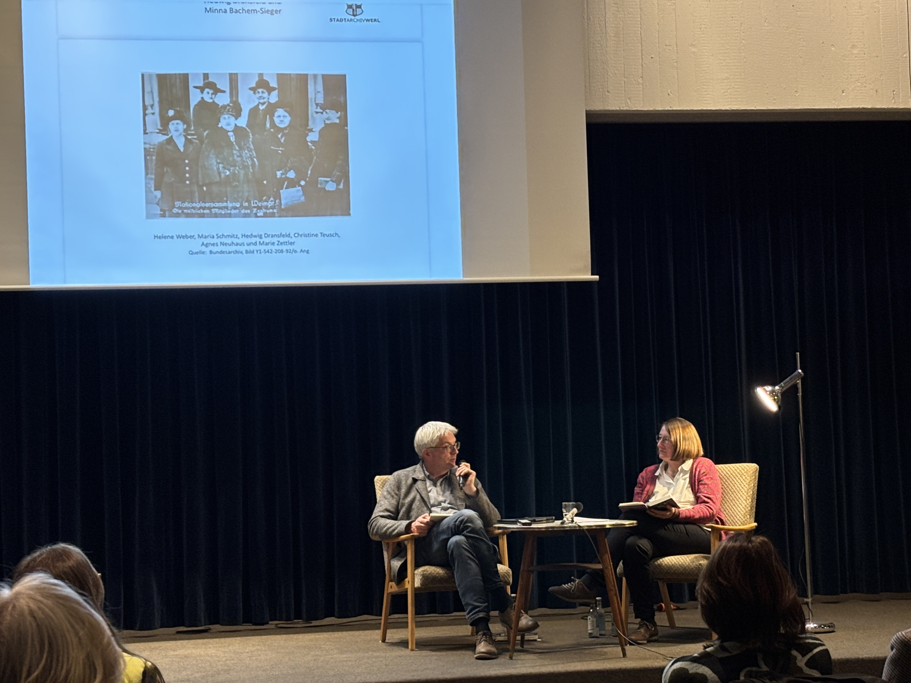 In einem lockeren und entspannten Gespräch mit Konrad Beckmann, dem Schulleiter des Ursulinengymnasiums, wurden spannende Einblicke in das Leben der Werler Ehrenbürgerin und der wohl „bekanntesten Bewohnerin des Ursulinenklosters“, so Beckmann, gegeben. So wurden sowohl Erlebnisse ihrer Kindheit in Hacheney beleuchtet, der frühe und Hedwig prägende Verlust der Schwester und auch der Eltern angesprochen. Ihr Weg zu den Ursulinen wurde nachgezeichnet und ihr Wirken an der Schule in der Neuerstraße beleuchtet. Von dort aus entwickelte Hedwig Dransfeld ihre Rolle als Schriftführerin der Zeitschrift „Die christliche Frau“ und trat damit in die katholische und politische Welt des frühen 20. Jahrhunderts ein. Entsprechend ging Barbara Schmidt auch auf Hedwig Dransfelds Wirken in der Nationalversammlung im Berliner Reichstag und schließlich auf ihren zu frühen Tod in Folge ihrer Erkrankung an Knochentuberkulose am 13. März 1925 ein.