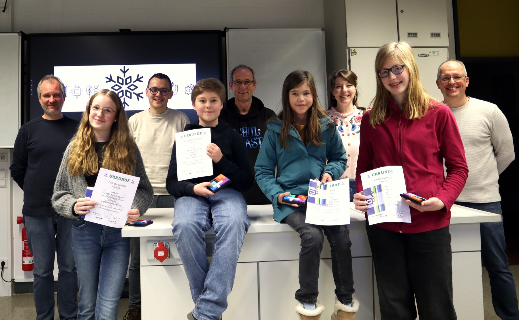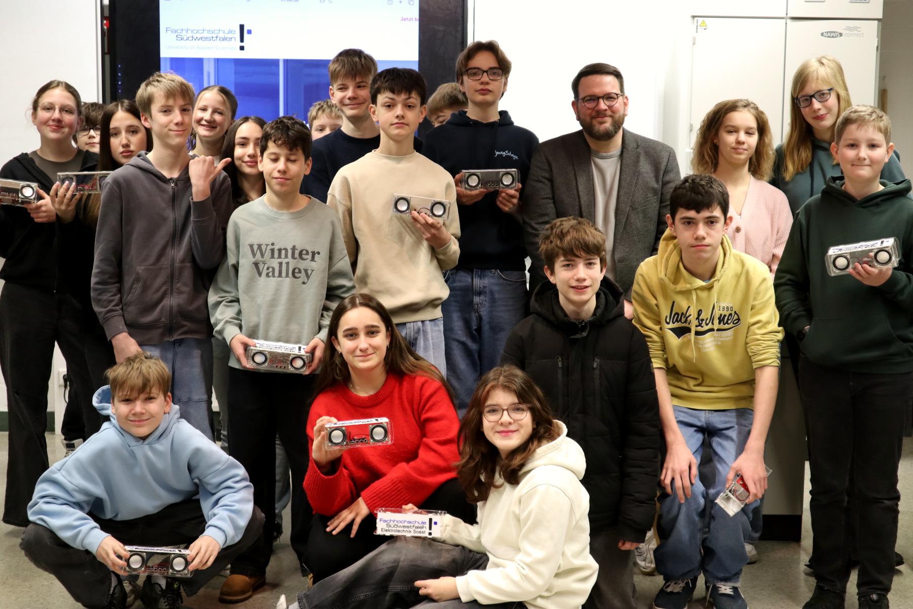 Am vergangenen Montag, den 26.01.26 durfte sich unsere Schule trotz Schneegestöbers über besonderen Besuch freuen: Herr Prof. Dr. Aufderheide vom Fachbereich „Elektrische Energietechnik“ an unserer Kooperationshochschule brachte die fertiggestellten Bluetoothboxen zu uns zurück, an denen die Schülerinnen und Schüler der Klasse 8c bereits im vergangenen Jahr im Rahmen eines Lötpraktikums am Fachhochschulstandort in Soest gearbeitet hatten.