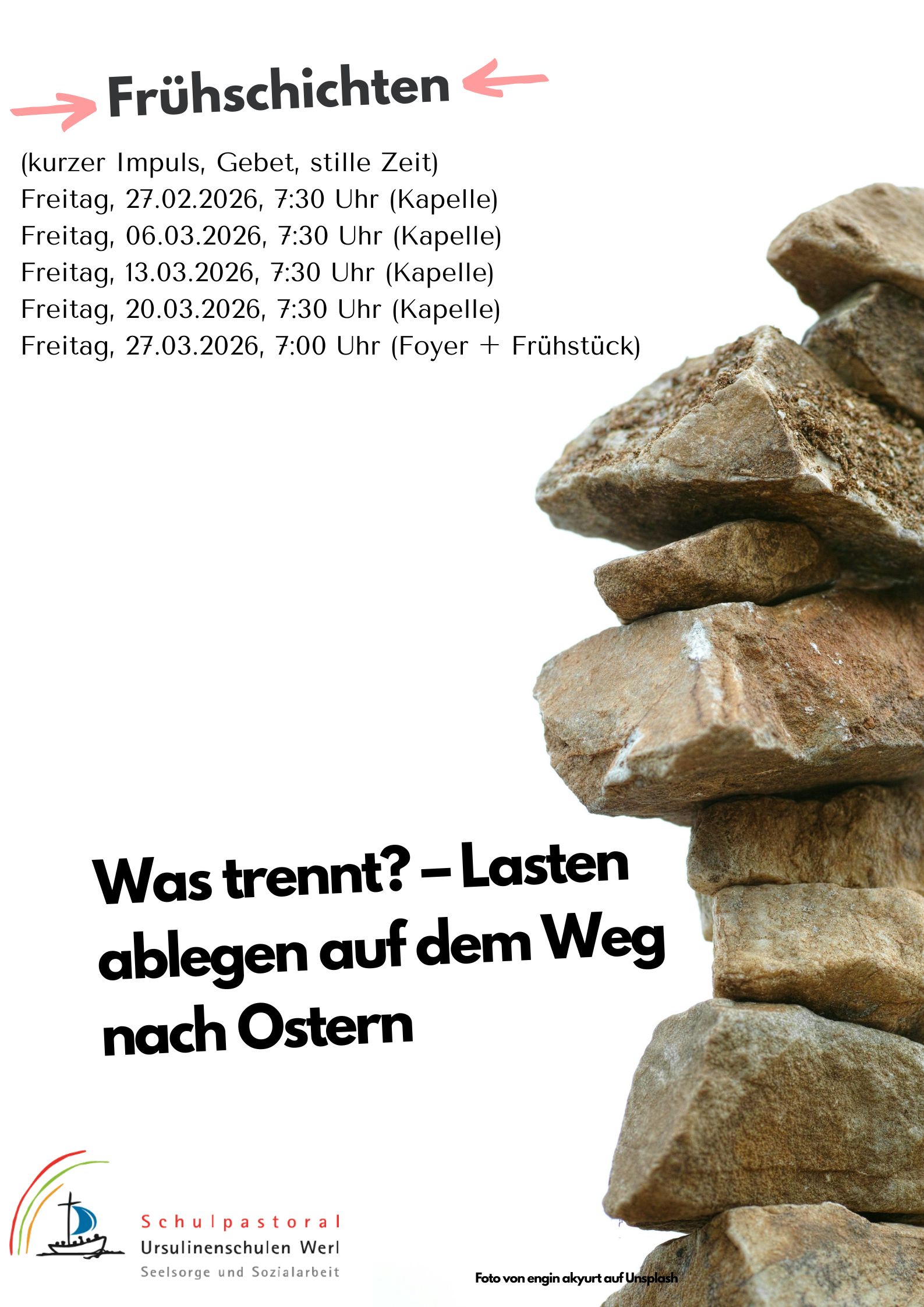Unser Plakat mit allen Informationen rund um die Fastenzeit an den Ursulinenschulen findet sich hier.(Plakat-Foto: Alex Noriega auf Unsplash)