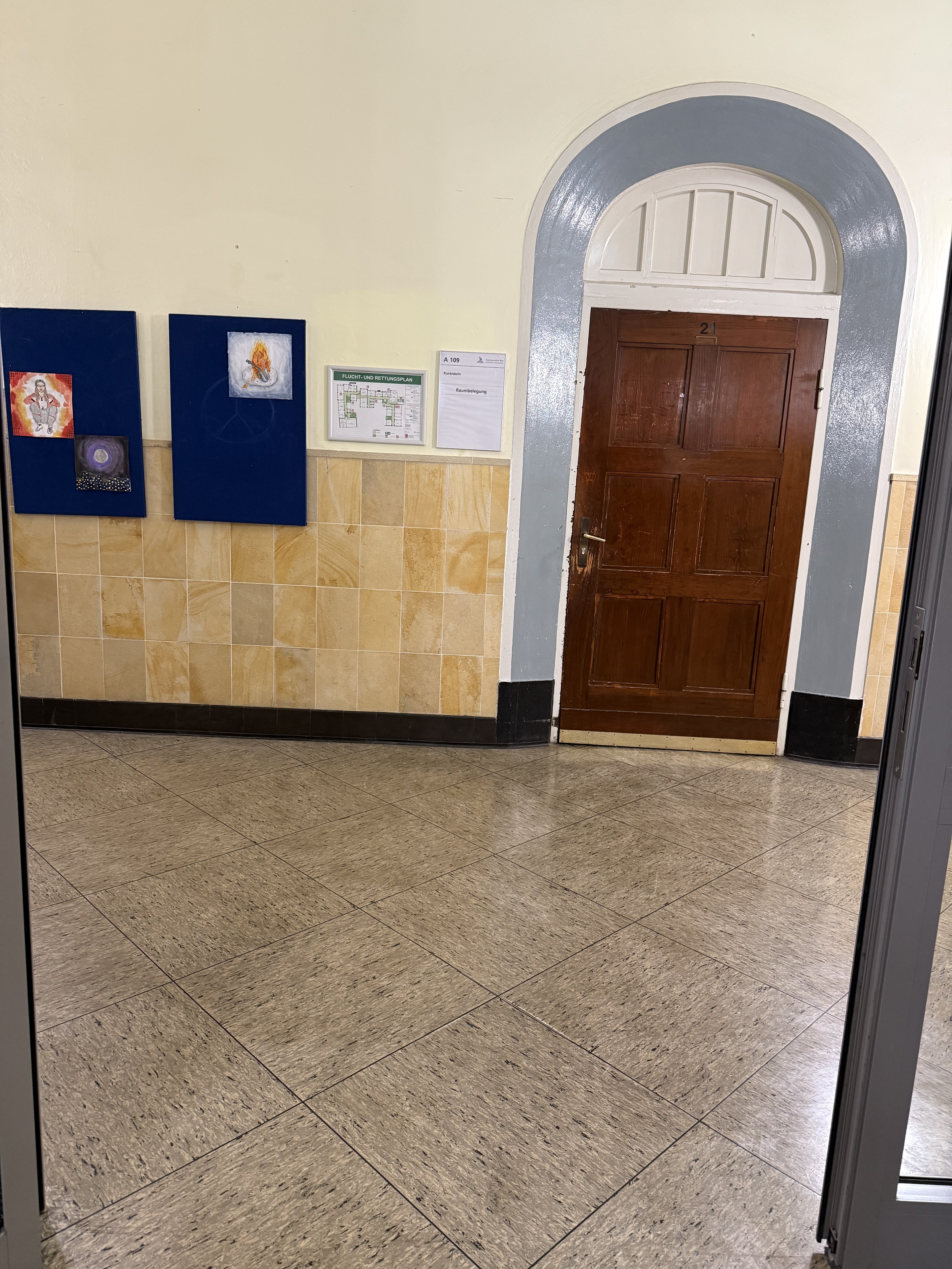 Und nun? Rechts oder links oder weiter runter? Das ist Klassenraum A109. Ich bin also im zweiten Stockwerk.