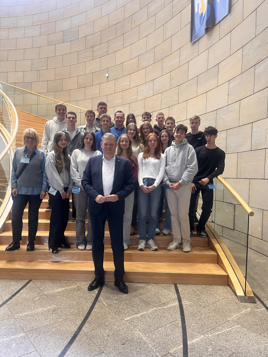 20 Schülerinnen und Schüler der Jahrgangsstufe Q 1 erlebten einen spannenden Tag im nordrhein-westfälischen Landtag in Düsseldorf. Trotz einer Bahnverspätung erreichten alle rechtzeitig das Parlamentsgebäude, passierten die Sicherheitskontrolle und wurden herzlich begrüßt – dann ging es direkt hinein ins politische Geschehen.