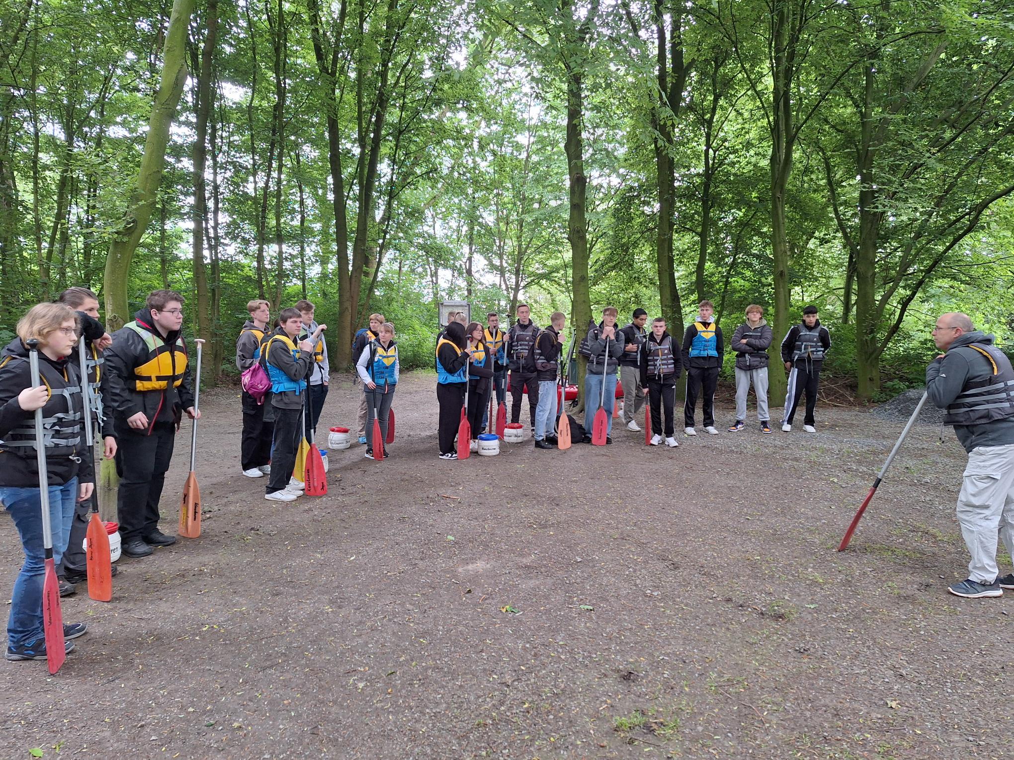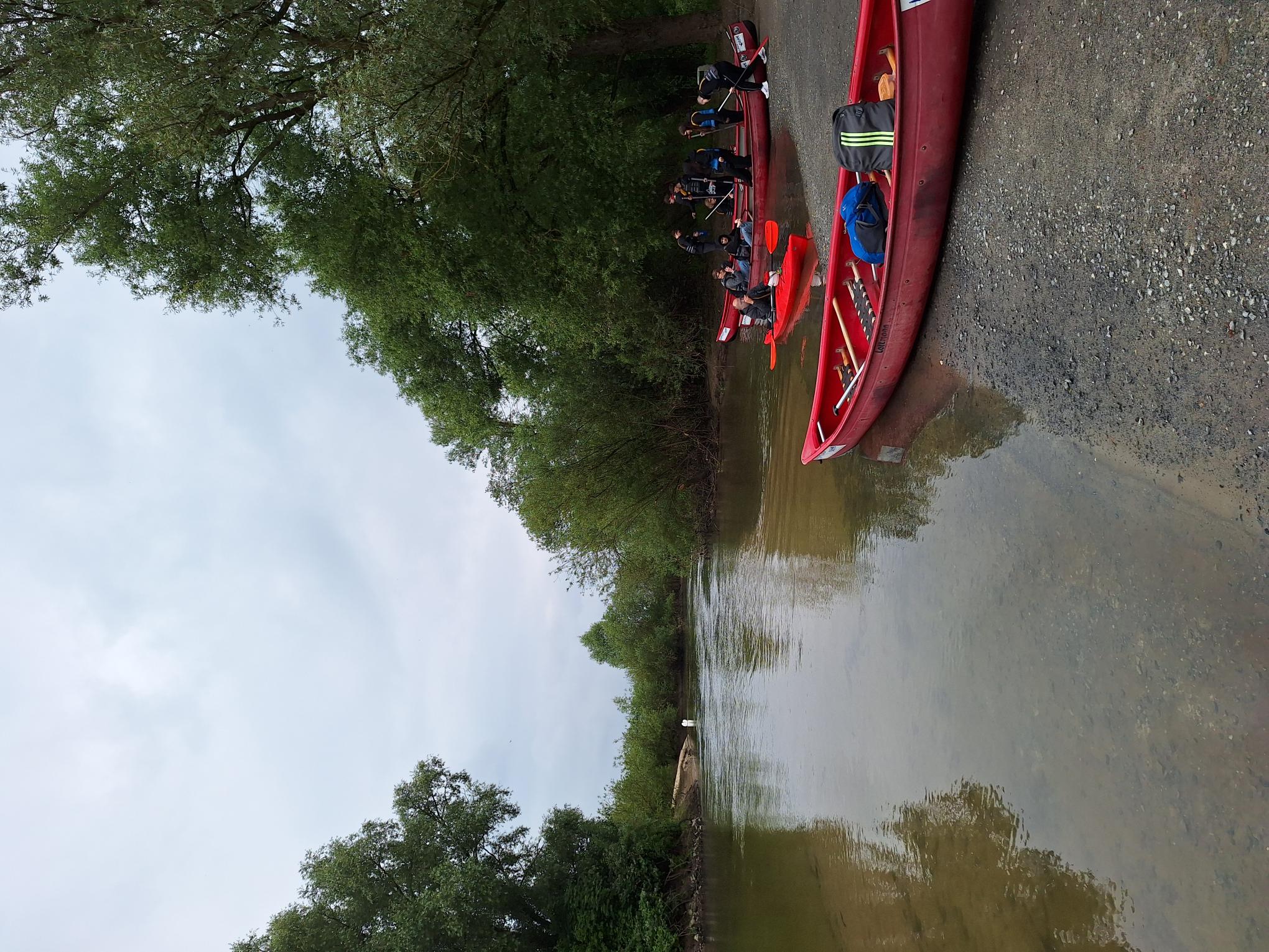 Dort angekommen, gab es für alle erst einmal eine Einweisung in den richtigen Gebrauch des Kanuequipments, welches aus einem Ruder, einer Schwimmweste und einem Kanu bestand. Dazu gab es eine Einweisung zu den Sicherheitsregeln. Es gab vierer und fünfer Kanus, auf die sich die Schüler und Lehrer jeweils aufteilten. Zur Mittagspause um halb zwei war bereits ein Kanu gekentert, jedoch fuhr es die gesamte restliche Strecke weiter mit. Neben einigen Stromschnellen gab es auf der Strecke eine Kanurutsche, die die Schüler und Lehrer unter Beobachtung und vorheriger Einweisung durch die Tourguides mit Spaß und Nervenkitzel passieren konnten.