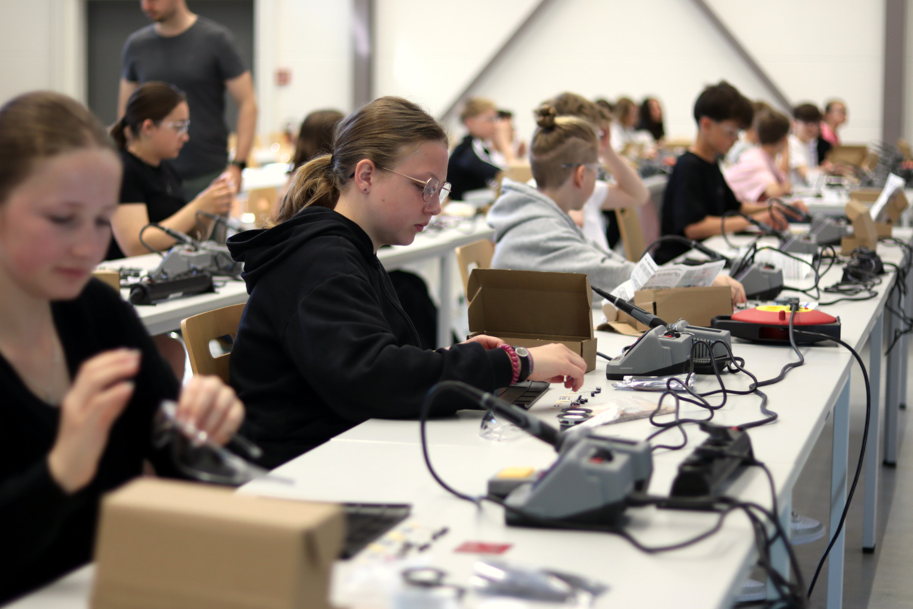 Nach einer kurzen Einführung, ging es auch schon los. Jeder hatte eine Platine, die er mit verschiedenen Teilen zusammenlöten musste. Nachdem wir ein paar Teile eingelötet hatten, machten wir eine kurze Pause, um zu essen und zu trinken. Nach der Pause löteten wir unsere Musikboxen weiter. Um kurz nach eins mussten wir aufhören da wir sonst den Zug verpassten. Für die Leute, die nicht fertig geworden