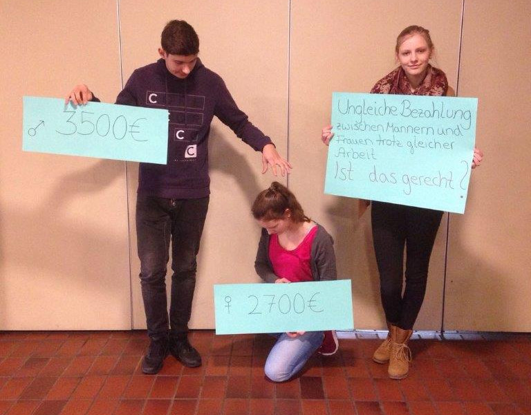 Eine andere Gruppe von Schülern stellte statistische Forschungsergebnisse zusammen, um die unterschiedliche Bezahlung von Männern und Frauen zu verdeutlichen.
