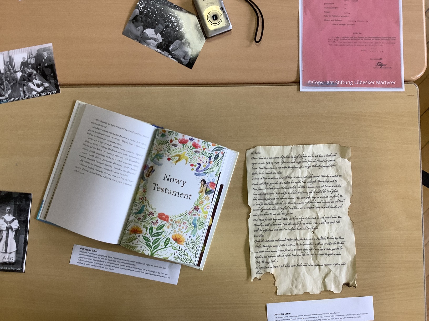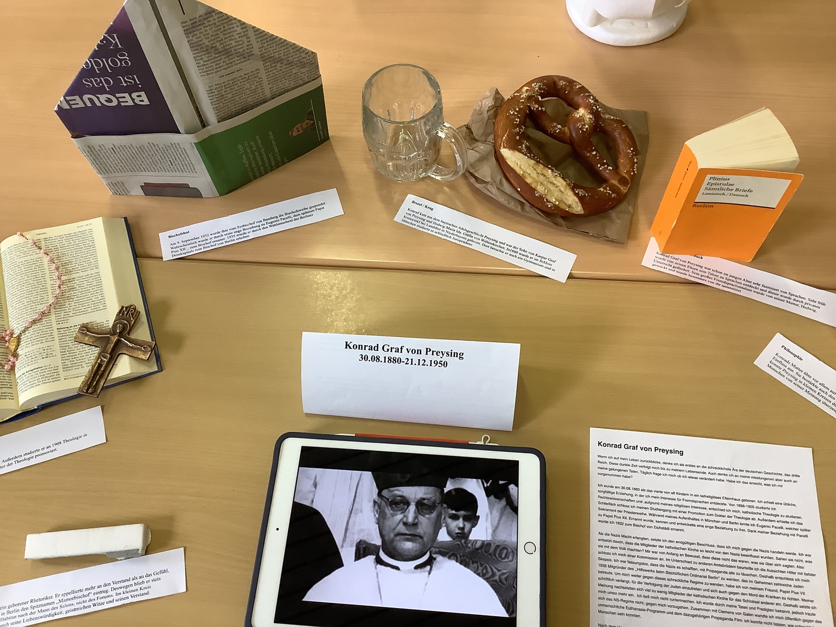 Als dann alles vorbereitet war, ging es an den Aufbau in Raum A001, der alten Sporthalle. Alle Tische wurden von den einzelnen Gruppen selbst, individuell und kreativ gestaltet. Jede Gruppe hatte ihren eigenen Tisch mit Persönlichkeiten aus der Nazizeit, wozu unter anderem Katharina Katzenmaier, Eduard Müller und die Geschwister Scholl gehörten. Neben Fotos, Bibeln und Texten auf den Tischen, gab es auch selbstgemachte alte Briefe, Hörbeispiele, kleine Videos, Schmuck und Kerzen zusehen.