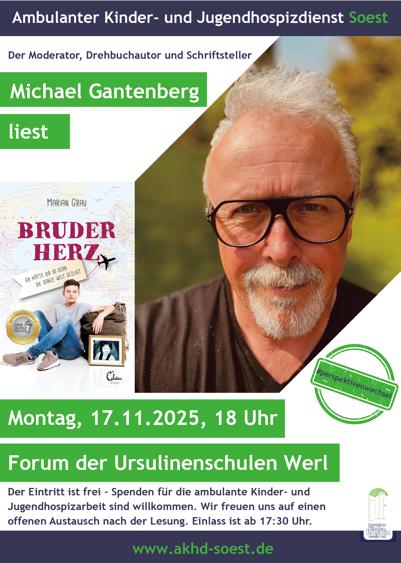 Wir freuen uns, am Montag, dem 17.11.2025, Gastgeber für den ambulanten Kinder- und Jugendhospizdienst (AKHD) für den Kreis Soest zu sein. Um 18:00 Uhr laden wir herzlich zu einer Schirmherr-Lesung mit Michael Gantenberg in das Forum der Ursulinenschulen ein.