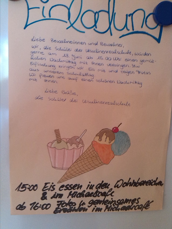 Bei schönstem Sommerwetter gingen sie bei ihrem letzten Besuch in alle Wohnbereiche und auch ins Michaelscafe um Eisbecher anzubieten. Mit einer Bildpräsentation stellten sie den Bewohnern ihre Schule vor. Dabei gab es manch vertraute Ansichten, denn das Ursulinenkloster und die Schulen sind vielen bekannt, aber auch neue Eindrücke, besonders von der aktuellen Baustelle. Schule damals und heute, dazu gab es an diesem Nachmittag viele Erinnerungen und interessierte Fragen.