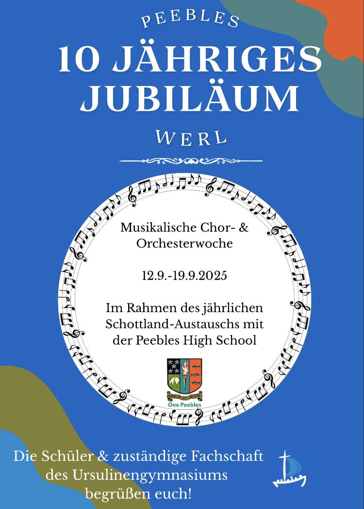 Auch unser 10. schottisch-deutscher Musikaustausch war erneut ein riesiger Erfolg! Nach gründlicher Vorarbeit in beiden Schulen - der Peebles High School (PHS) aus Peebles/Schottland und den Ursulinenschulen Werl - wurde vom 12.-18.09.2025 von insgesamt über 60 schottischen und deutschen Schüler*innen intensiv gemeinsam geprobt, die deutsche, insbesondere die westfälische Umgebung und Kultur, das jeweilige Familienleben kennengelernt sowie neue Freundschaften geknüpft, bzw. schon existierende weiter ausgebaut und verstärkt.